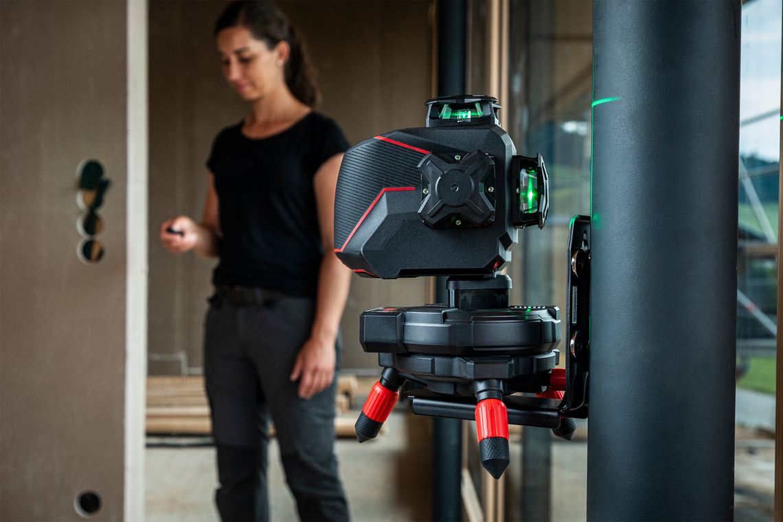 Mit der Fernbedienung lassen sich Laserlinien aus bis zu 30 Metern Entfernung kontaktlos ausrichten. Die Fernbedienung ermöglicht die Rotation des Lasers im und gegen den Uhrzeigersinn in drei wählbaren Geschwindigkeitsstufen für ein schnelles und millimetergenaues Ausrichten der Vertikallinie. Die Horizontallinie kann entweder millimetergenau oder mit einem einzigen Tastendruck auf die maximale Verstellhöhe von 2 cm ausgerichtet werden. So gelingen exakte Ergebnisse mit minimalem Aufwand – ganz ohne Nachjustieren am Gerät. Der integrierte Li-Ion Akku mit USB-C-Anschluss ist wiederaufladbar.