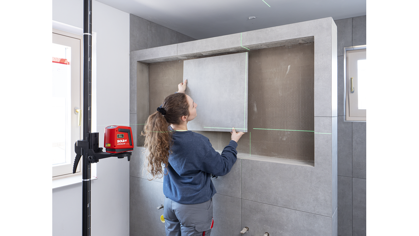 The CROSSLINE GREEN NX green cross line laser with green laser diodes projects horizontal and vertical laser lines at a right angle. The bright and high-contrast REAL GREEN laser lines are suitable for high-precision tasks in interior areas. The continuous pulse functionality increases the application range of the CROSSLINE GREEN NX with a handheld receiver to 80 m.
