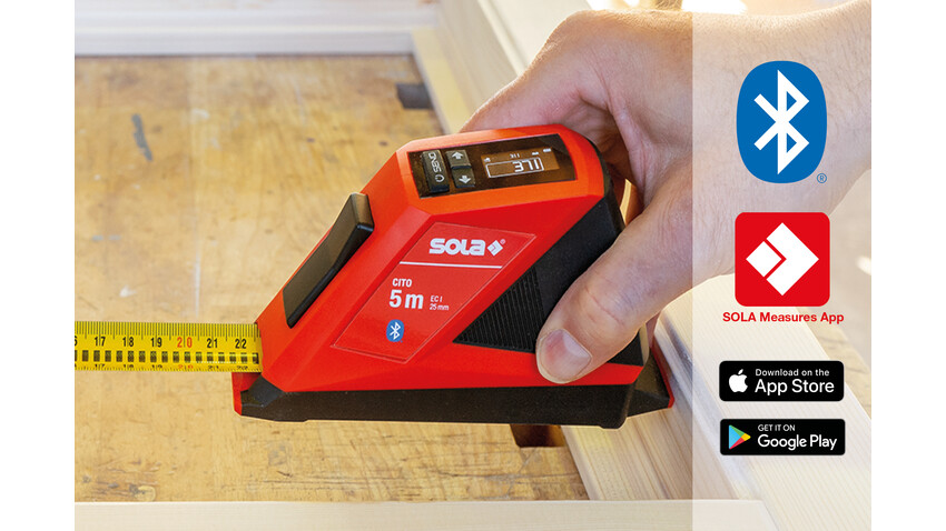 Medición precisa y documentación digital de los valores medidos: El CITO mide longitudes de hasta 5 m con una tolerancia de medición de ±1,0 mm y muestra el valor medido digitalmente en pantalla, ya sea en mm o en cm. El CITO se conecta rápidamente a la aplicación SOLA Measures mediante Bluetooth. Esto permite transferir los valores medidos directamente del CITO al smartphone para dimensionar las fotos o los planos de construcción.