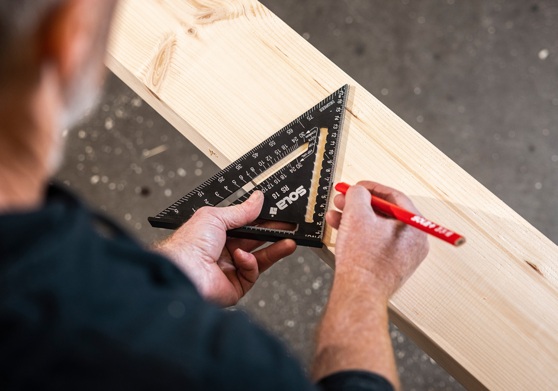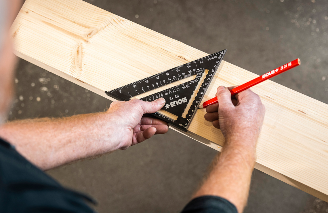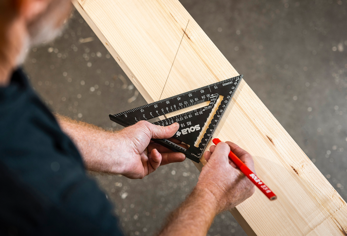 Las diferentes escalas y rebajes de la escuadra de carpintero, así como su práctico tope, están especialmente diseñados para el trabajo con materiales de madera en todo tipo de aplicaciones de carpintería. La escuadra de carpintero triangular proviene originalmente de Estados Unidos, donde todavía se usa principalmente en carpintería para la construcción de techos y vigas. De ahí que su nombre en inglés sea «rafter square» (rafter = vigas). Con la escuadra de carpintero triangular se puede medir la inclinación o el ángulo para vigas normales y vigas parejas («common rafters»), limatesas («hip rafters») y limahoyas («valley rafters»), así como vigas auxiliares.