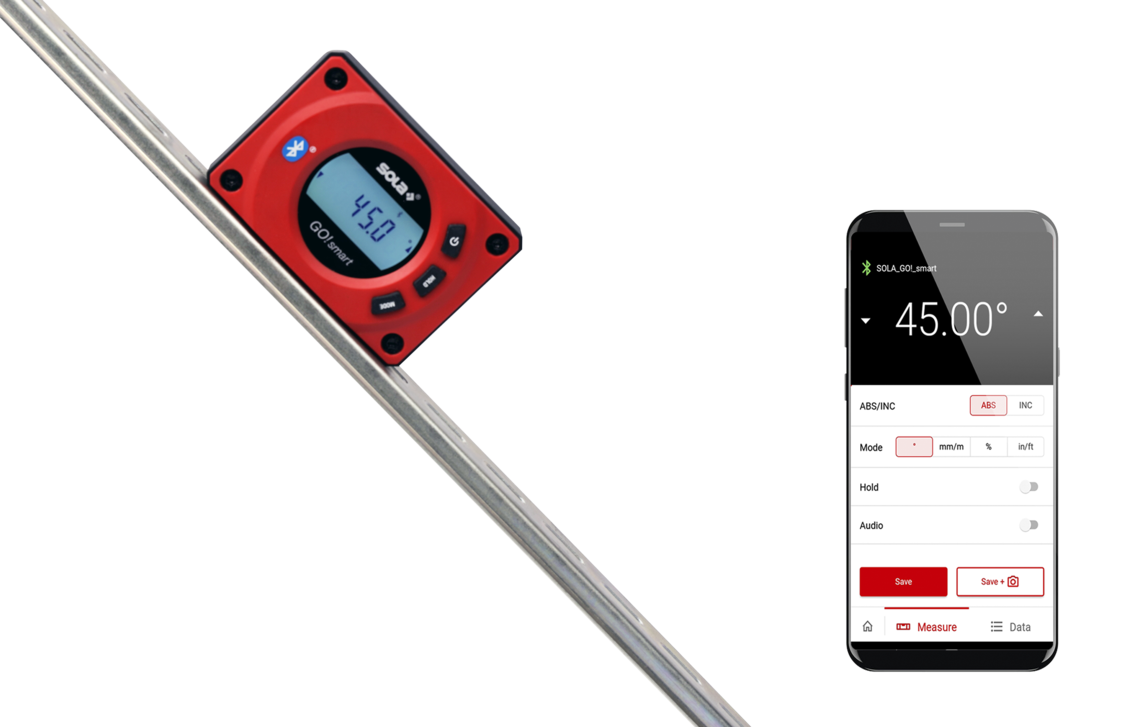 Mesure d’inclinaisons et de pentes, calcul d’angles ou nivellement d’objets : Lors de chaque mesure, la valeur mesurée est transmise directement de l’appareil de mesure SOLA au smartphone en temps réel via l’application. C’est utile dans les situations dans lesquelles le contact visuel avec l’écran de l’appareil de mesure est difficile ou impossible.