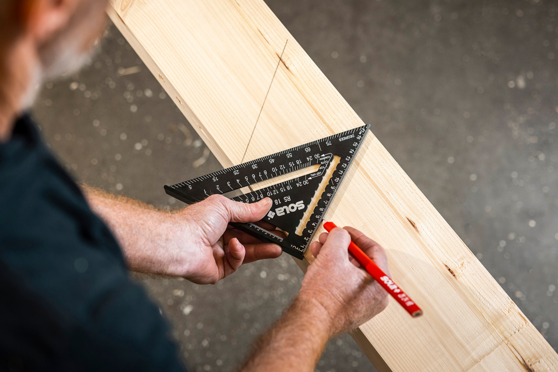 A SOLA talpas ácsderékszöge egyesíti a vonalzók, a talpas derékszögek, a szögvonalzók, a szögmérők, az előrajzolók, a fűrészvezetők és a tetőszarufa-mérők funkcióit. A derékszögű háromszög alakú szögmérős ácsderékszögek egyik befogóján masszív talp található, amely segít a 90°-os és 45°-os szögek pontos kijelölésében. A talp egyben fűrészelési segédeszközként, illetve fűrészvezetőként is szolgál. Az ütközővel párhuzamosan egy milliméter- és centiméter-pontosságú metrikus skálával (eltolási skálával) ellátott bemélyedés látható, amely kifejezetten ideális a merőleges vonalak kijelölésére. A másik befogó mérőszárán szintén található egy metrikus skála, amely gyors mérést tesz lehetővé. Ezalatt a skála alatt egy olyan bemélyedés található, amellyel vízszintes vagy párhuzamos vonalak jelölhetők ki. Az átfogó fokskálája a 0 és 90° közötti szögmérésekhez használható. A kívánt szögfok meghatározása a szemközti forgáspontból kiindulva történik (jelölés a szögmérős ácsderékszögön: PIVOT). A fokskálával párhuzamosan elhelyezkedő bemélyedés két skálája sarokillesztések jelölésére szolgál. Az alsó skála a közönséges vagy normál szarufákra vonatkozik (jelölés a szögmérős ácsderékszögön: COMMON), a felső pedig az él- és vápaszarufákra (jelölés a szögmérős ácsderékszögön: HIP-VAL). A fokskálára merőlegesen elhelyezkedő 90°-os jelölősegéd szelemenes vágásokhoz használható.