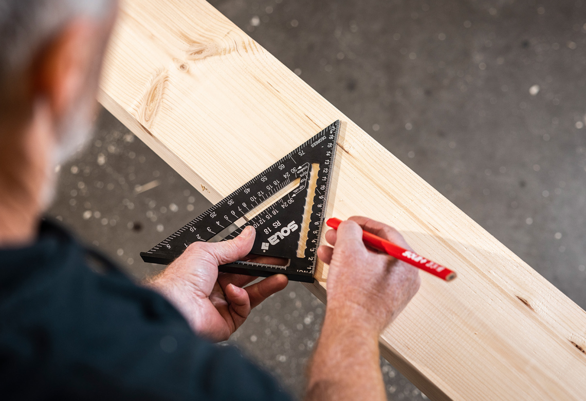 A talpas ácsderékszög a gyors berajzolások érdekében 45°-os szöggel is rendelkezik. Ehhez a talpas ácsderékszöget az ütközővel a szarufára vagy a munkadarabra kell helyezni, és egy vonalat kell húzni a talpas ácsderékszög hosszú oldala mentén. A 45°-os szög másik irányba történő beigazításához mindössze meg kell fordítani a talpas ácsderékszöget.